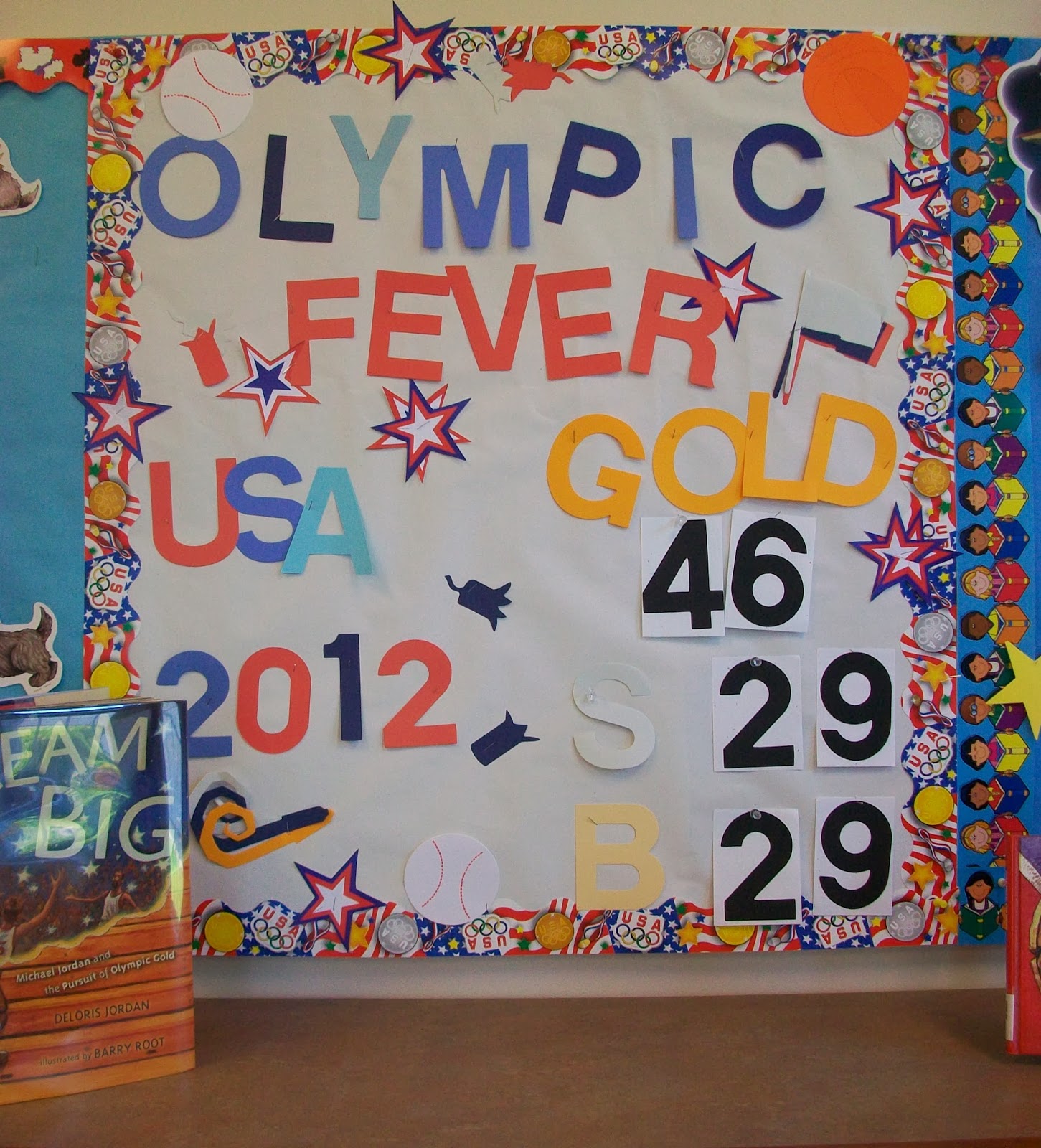 Free sports bulletin board and classroom decorating ideas. There are several options that you can mix and match or create multiple engaging displays. Get black sheet paper and cover a bulletin board with it. Easy idea for olympic themed bulletin board to welcome students back to school.
